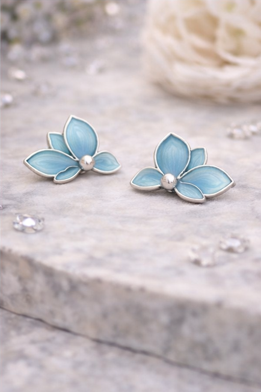 Elevate your everyday style with these beautifully crafted aqua half-flower stud earrings, designed to reflect soft elegance and modern charm. Featuring a graceful 5-petal half-bloom design, the earrings showcase glossy aqua enamel petals with a sleek silver-tone outline, creating a refined contrast that catches the light effortlessly. Some petals subtly peek from behind, adding depth and dimension to the floral silhouette.