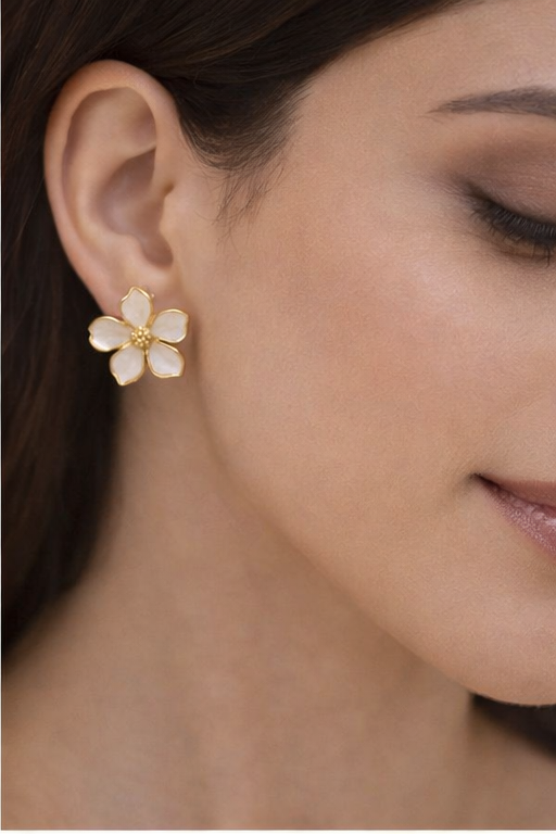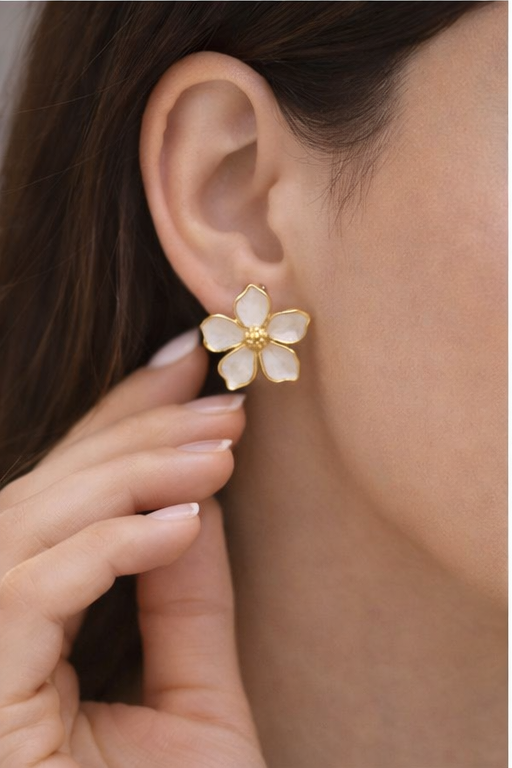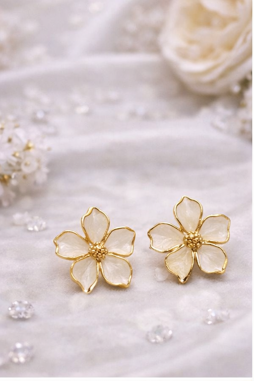 Add timeless elegance to your jewelry collection with these beautifully crafted white floral stud earrings. Designed with delicate white enamel petals outlined in a soft gold tone, these studs capture the graceful charm of a blooming flower. The textured gold center adds a subtle hint of luxury, making the design both refined and eye-catching.
